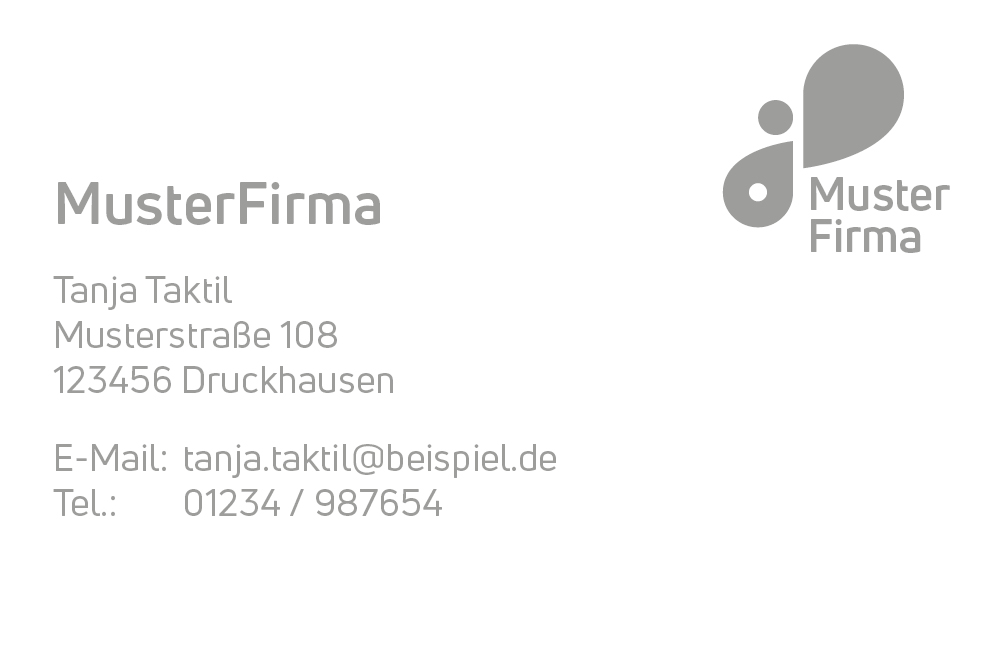 Bitte beachten Sie, dass die Größe der Brailleschrift an festgelegte Normen gebunden ist, und dass aufgrund dessen weniger Informatonen auf der Visitenkarte platziert werden können, als im normalen "Schwarzdruck". Wir empfehlen Ihnen Name und Telefonnummer/E-Mail aufdrucken zu lassen. Bitte beachten Sie unseren Datenleitfaden.